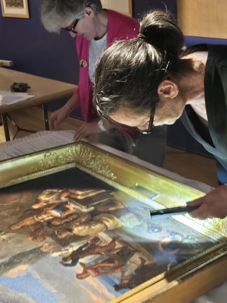 Déballage, constat d’état et accrochage dans les salles des trois tableaux prêtés par le Musée des Augustins.